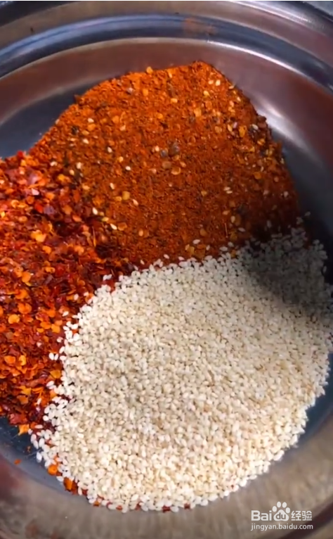 首先称取干辣椒片、干辣椒粉末和干白芝麻,放在碗中备用,如果材料不够干燥,可以再低温的锅中烘干再使用。