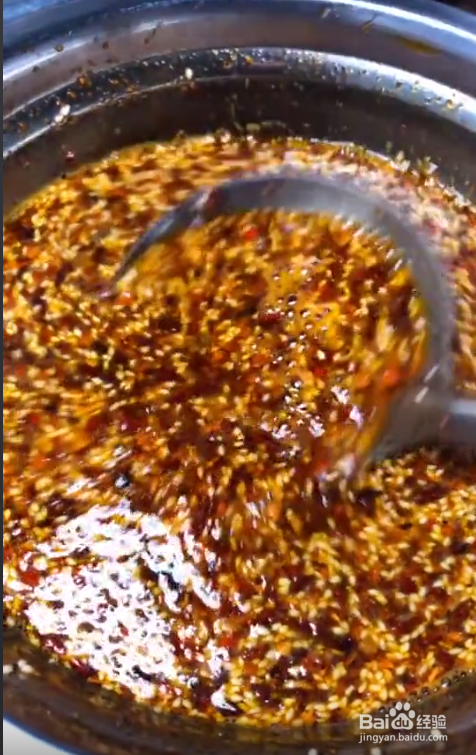 在准备好的辣椒芝麻中加入一勺食用油,可以防止炸糊,再放入一勺高度白酒(60度),可以起到增加香味的作用。