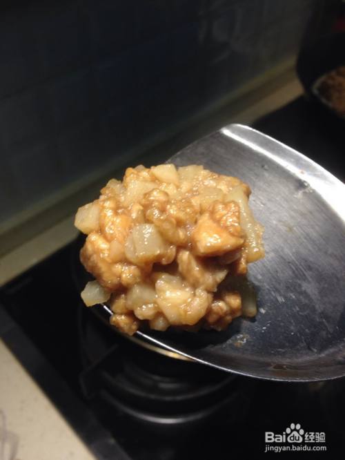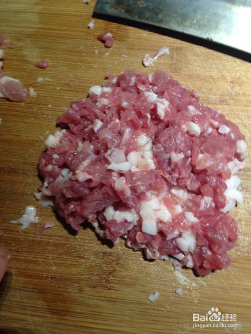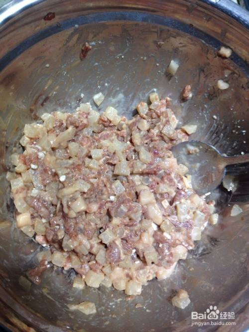 肉切小丁,千万不能图省事拿来剁,剁成糊糊的就不好看也不好吃了!完了以后伴入糖,料酒,味极鲜和老抽,腌制一会。