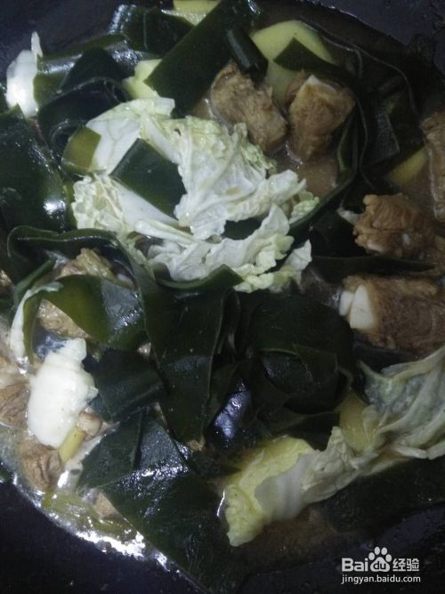 待排骨软烂后向锅内倒入处理好的海带、土豆及白菜,继续文火炖。