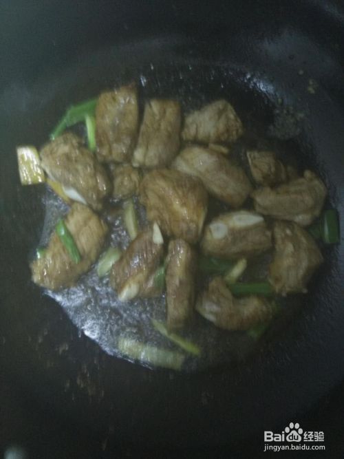 锅内倒入食用油,油热后将排骨倒入锅中翻炒,翻炒过程中加入适量食盐,待肉变色后加入葱段、姜段及少量酱油继续翻炒,大约三分钟后向锅内倒入清水,水要没过肉块,武火加热。