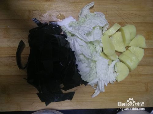 排骨炖煮过程中将海带洗净切条,土豆切块,可以加白菜也可以不加白菜,依个人口味而定。