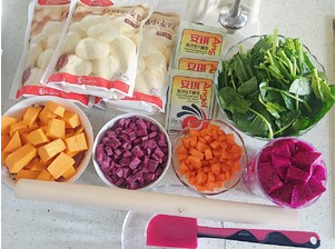 食材洗干净,切小块,备用。南瓜,紫薯入锅蒸,中火大概十分钟左右用筷子能压软就差不多好了(可以盖锅闷一会,先准备其他蔬果汁)