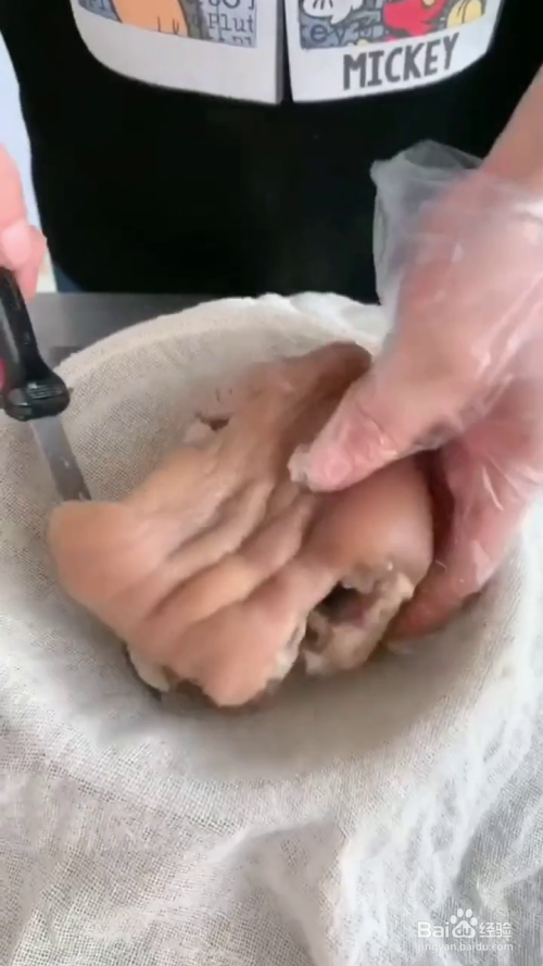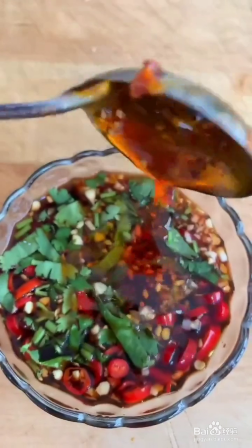 然后关火焖半小时,取出肘子去骨,用纱布裹紧定型,放入冷藏八小时,冷藏到时间后,我们在碗中加入蒜末,小米辣,香菜