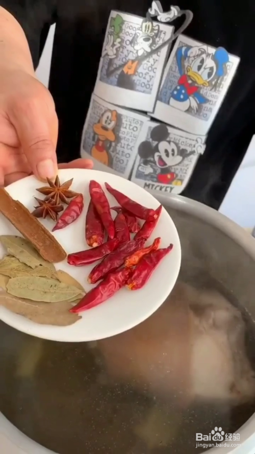 我们将大肘子烧皮洗净,冷水下锅,煮开后撇去浮沫,再放入葱姜,料酒,干辣椒,大料,盖上盖子后上汽压三十五分钟