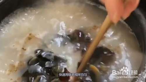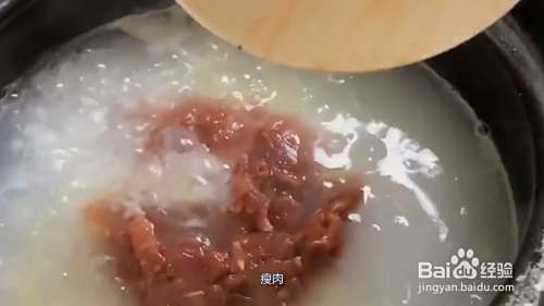 将生米熬成白粥,开小火慢炖,放入姜丝,瘦肉,用筷子搅拌均匀。
