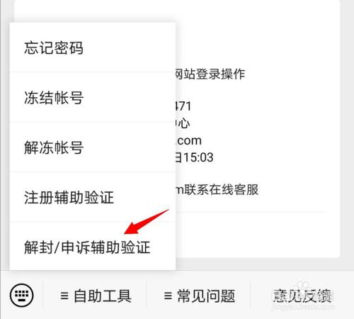 点击后,在上方的选项列表中,点击【解封/申诉辅助验证】选项。