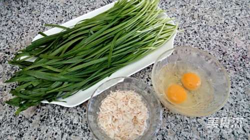 5韭菜切末,放入鸡蛋碎和虾皮。