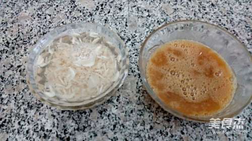 2虾皮用水泡一下,鸡蛋里放1小勺蚝油搅拌均匀。