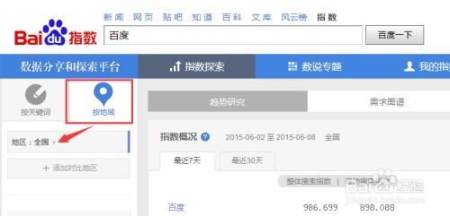 输入关键词“百度”后,点击百度一下,跳出这个词的相关数据。在左下方选择“按地域”,选择具体的城市地域。