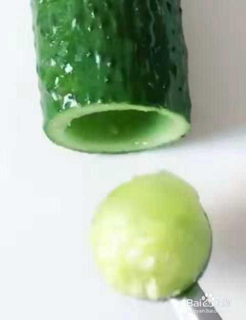 把黄瓜根部切掉,用小勺子挖出圆形,见下图