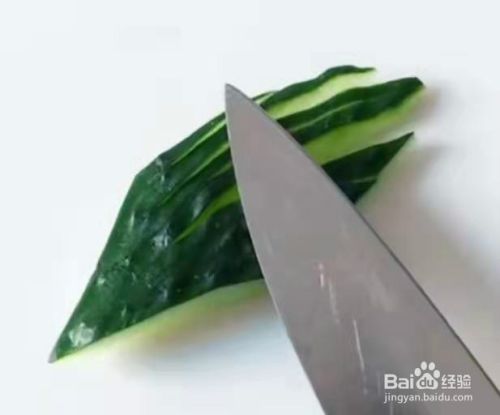 把黄瓜竖着对半切开,再切成菱形,再如下图切开做葡萄叶。见下图