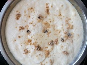 模具底上刷油,倒入搅拌好的蛋糕液。上层放葡萄干或者趣多多饼干碎。(或者喜欢的水果块、干果碎都好)