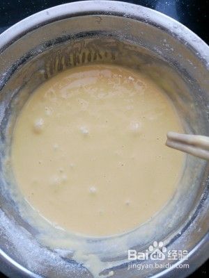 加入牛奶,和蛋黄一起搅拌。一点点加入面粉,搅拌成糊状。(普通面粉即可,糊状稠一些成品会密实一些,稀一些会松软。)