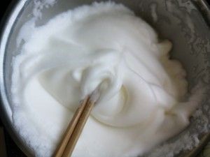 蛋清里加一点点白醋(柠檬汁也好),加入少许白糖,开始打发。(用筷子,手工打发25分钟即可,有打蛋器更轻松。)