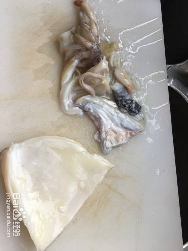 将墨鱼开膛,抽去背上的硬骨片,将肚中的黑墨囊和黄肚都去掉,清洗干净后,切片刀(或花刀)改小块,这样容易入味。