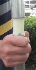 从包装箱取出安装支架及安装配件(图1),把圆形铁片从钢管底部穿入(需高于钢管下方的圆形小孔),把销子插入钢管下方的圆形小孔,把圆形铁片固定好(图2),最后把安装支架整体旋转插入土中(圆形铁片要紧贴地面或埋入土中)固定好,安装完成(图3)。