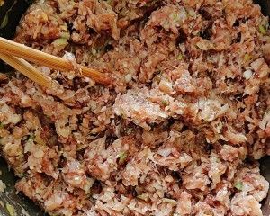 羊肉剁碎,加入香油拌匀,再加料酒,姜,葱,花椒粉,白胡椒粉,十三香,生抽,酱油,老抽,耗油,