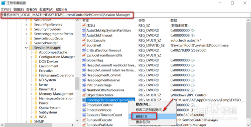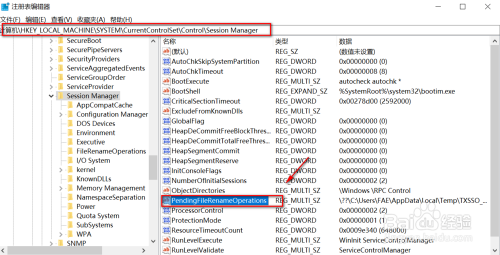 进入注册表面板,在注册表内依次进入HKEY_LOCAL_MACHINE\System\CurrentControlSet\Control\SessionManager\找到PendingFileRenameOperations,如下图所示
