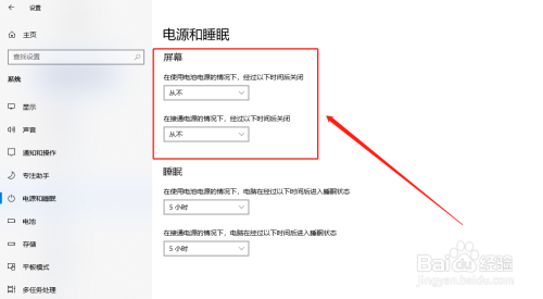 点击屏幕下方“在接通电源的情况下,经过以下时间后关闭”的下拉框,选择合适的时间,在使用电源的情况下同理