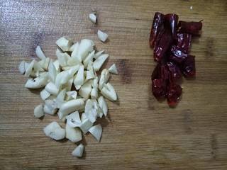大蒜和干辣椒切碎。