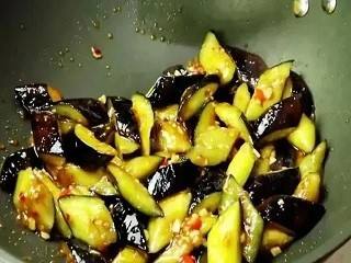 倒入茄子、清水、食盐、生抽、蚝油、鸡精、白糖和陈醋,炒匀。