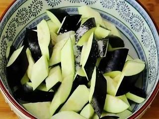 茄子清洗干净,切成小块,加入食盐,搅拌均匀,腌制1小时。