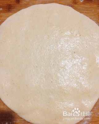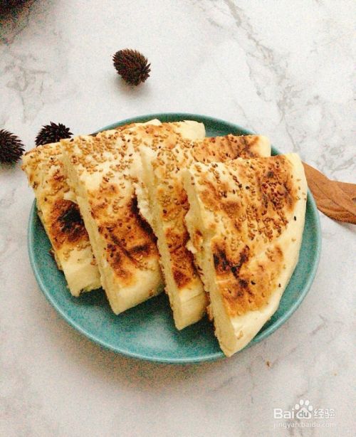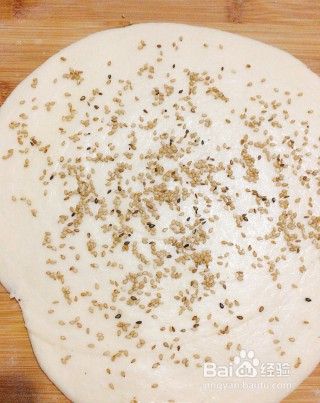 再次擀成饼状,表面抹一层清水,撒熟白芝麻,锅中加入植物油,煎至两面金黄即可。