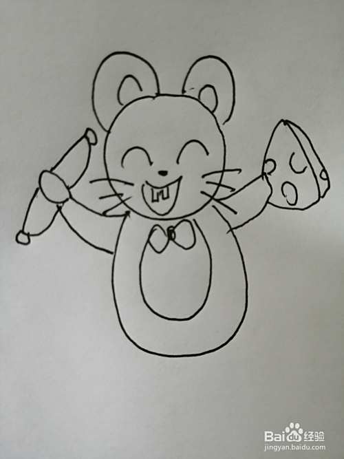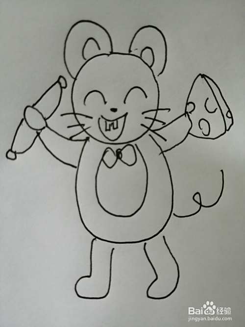 第六步,然后在可爱的小老鼠的另外一只小手上画出蛋糕,小老鼠真贪吃。
