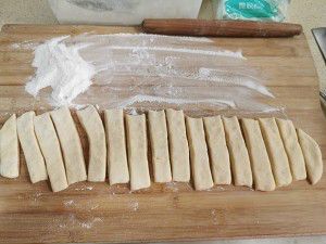 擀面杖擀成长条,可以边擀边用手拉伸,切成小长条