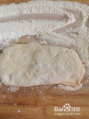 取出面团,撒一些干面粉,不要揉搓,整成长方形