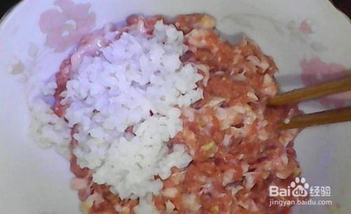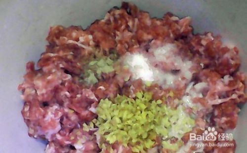 肉末放姜,盐,生抽,糖,胡椒粉,料酒,芝麻油,水淀粉按一个方向拌匀