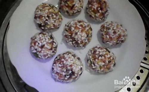 把拌好的肉末挤成丸子放入盘中,裹上米