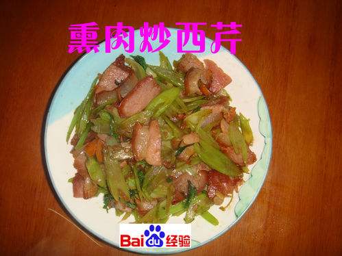 4熏肉切成与西芹宽度差不多大小的片后洗净!