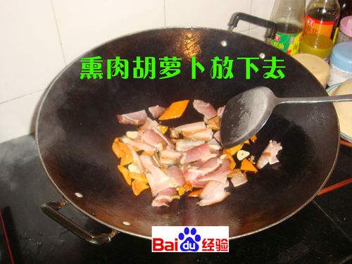 7倒入熏肉一起炒,至熏肉变色!看下图