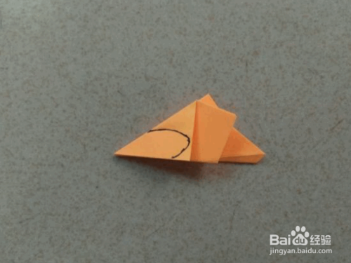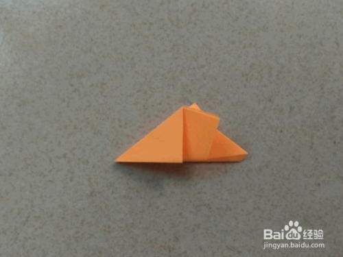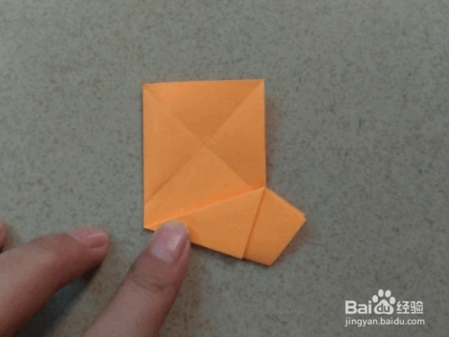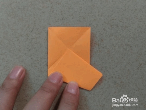 矩形另一端的角(未展开角)向第二步两条折痕相交处翻折。 然后折好的部分翻折回去。