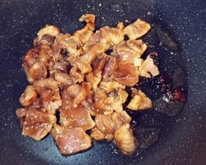黑猪肉切厚片,胡椒粉、生抽、淀粉、料酒,拌匀,腌制5分钟。食物油入锅,八角花椒入锅,倒入黑猪肉,炒香。