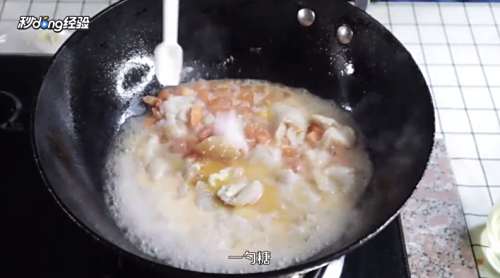 8轻轻翻炒,加入一大碗水,适量的盐和鸡精,一勺糖。