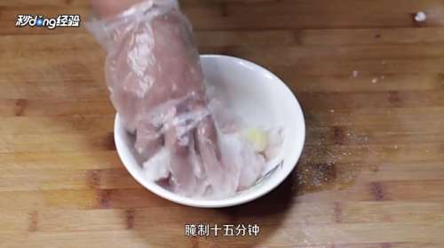 2加入姜片,一小勺油,两勺淀粉,两勺料酒,盐少许,抓匀腌制十五分钟。
