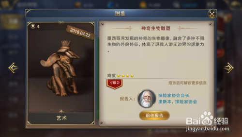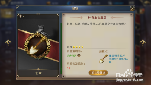到达目的地后,继续采用挖满就退出再重进的方法,直到发现发现物神奇生物雕像,任务完成。