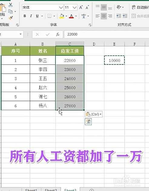 在空单元格中任意位置输入1万,然后点击复制,框选所有人的工资,右键选择性粘贴