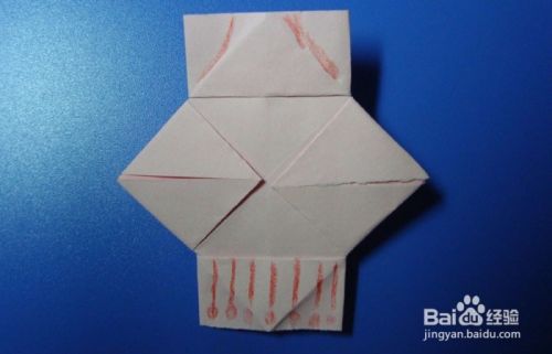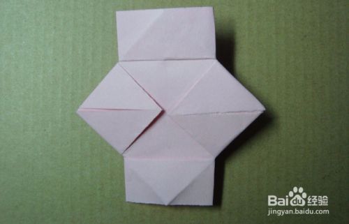 然后把正方形彩纸向上和向下提拉翻折,并压平整,这样小灯笼的形状就做好了,如下图所示。