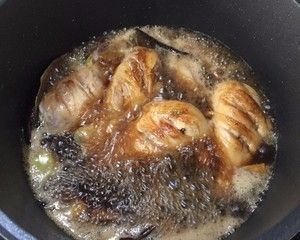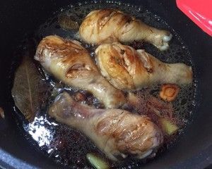 鸡腿上色以后,加入料酒2勺,生抽3勺,老抽2勺,冰糖5颗,再加入适量清水,基本没过鸡腿就可以了。