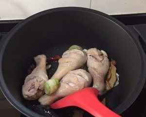 放入焯过水的鸡腿,和配料一起翻炒均匀。