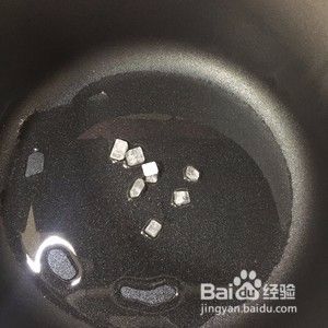 锅热放油,先放10粒冰糖,小火慢慢炒至冰糖融化。