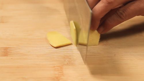 1把洗好的姜切片,一旁备用。