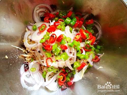 洋葱切成丝,红辣椒,青辣椒切成颗粒。
