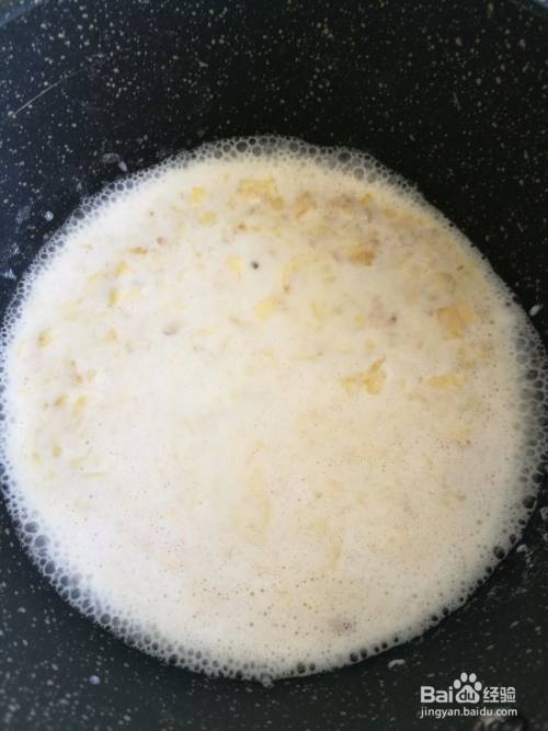 搅打好的牛奶香蕉燕麦倒进锅里,小火煮开即可食用