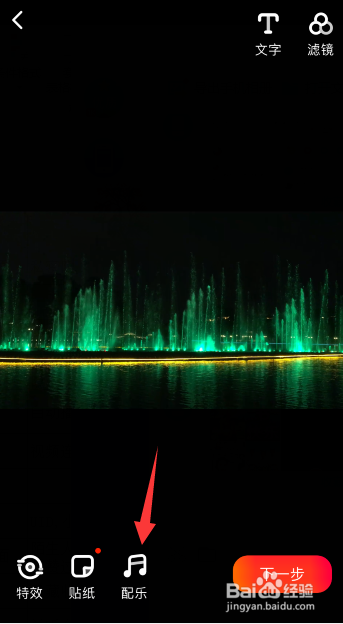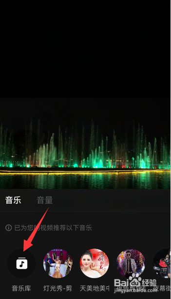 3、点击底部“配乐”,点击左下角“音乐库”,点击想要添加的音乐,点击“确认使用”就添加上了背景音乐,然后继续把视频发布即可