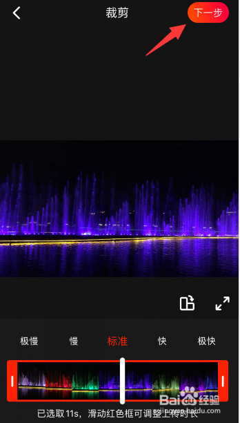 然后在相册中找到需要发布的视频,选择后,点击右上角“下一步”